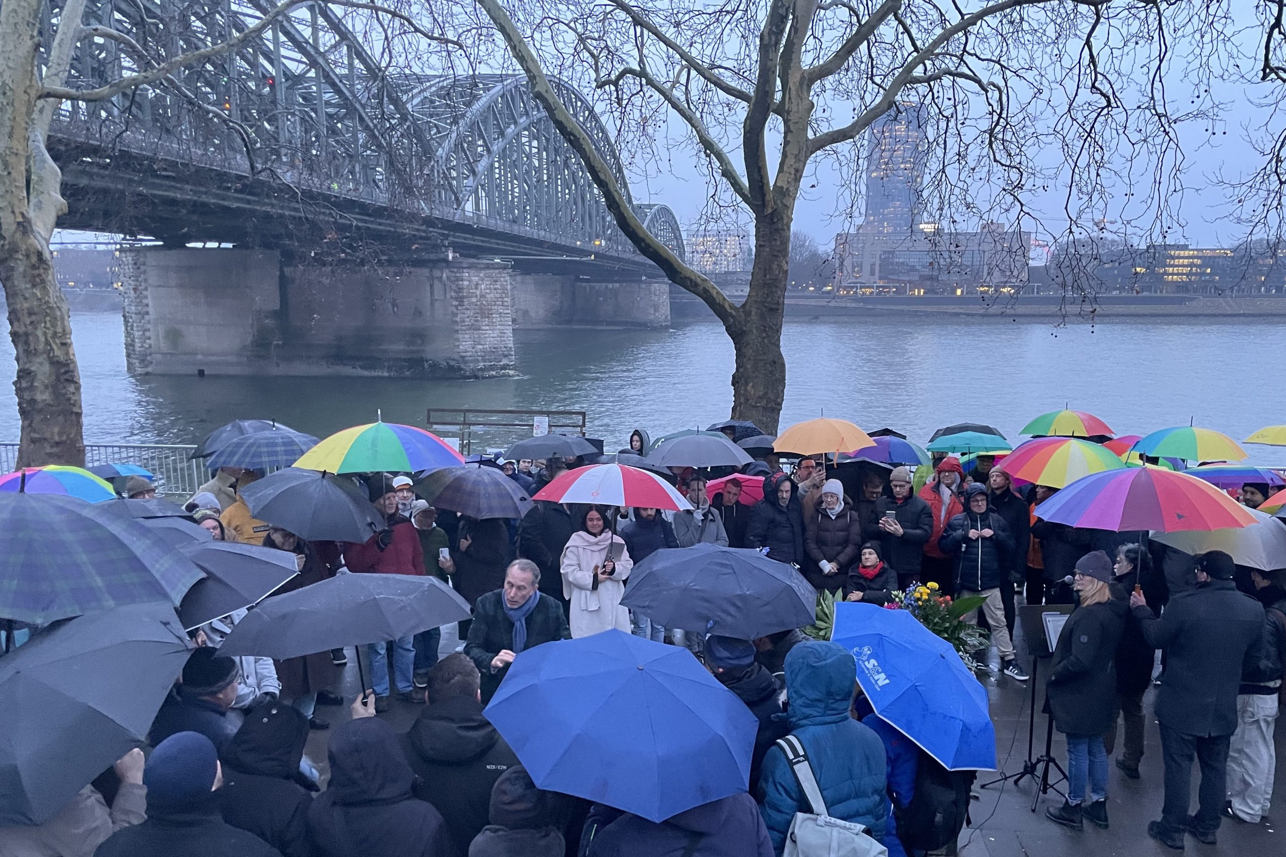 Trotz regnerischen Wetters fanden sich knapp 150 Menschen ein, um mit einer Schweigeminute und Blumenniederlegung im Rahmen des Gedenkens ein kraftvolles Signal gegen Ausgrenzung, Hass und Gewalt in unserer Gesellschaft zu senden. Auch der WDR war dieses Mal mit einem Kamerateam präsent und zeichnete die Versammlung für die Sendung Lokalzeit auf.